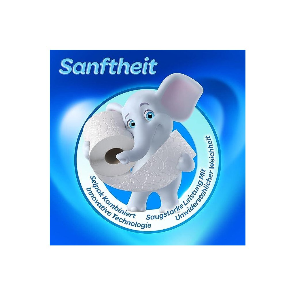 Velké balení kvalitního jemného 3-vrstvého toaletního papíru bez parfemace je vyroben ze 100% celulózy. Velký návin každé role obsahuje 150 útržků (délka role 18,4m) o velkém rozměru 12,4x9,6cm*. Balení v plastovém obalu obsahuje 24 rolí