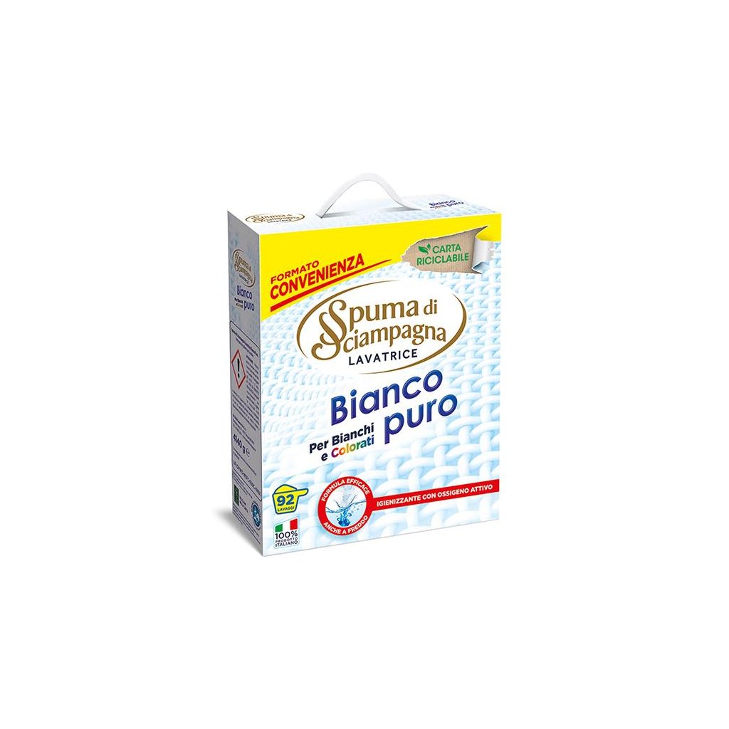 Spuma di Sciampagna prací prášek Bianco Puro universal - 92 pracích dávek .Kvalitní italský prací prášek s extra účinkem při praní a technologií deodress, která zajišťuje dlouhodobou svěžest prádla i při nošení. Tento prací prášek je v recyklovaném obale. Vhodné použití na univerzální praní (bílé i stálobarevné prádlo).Značka Spuma di Sciampagna je tradiční italský výrobce domácí drogerie a chemie od 30. let minulého století. Tato značka se inspirovala francouzskými parfémy původem z Champagne a z to pochází i název Spuma di Sciampagna což je v překladu pěna šampaňského. Značka Spuma vyrábí ve svých závodech prací detergenty jako jsou prací prášky, prací gely nebo bělidla ale také tělovou kosmetiku.